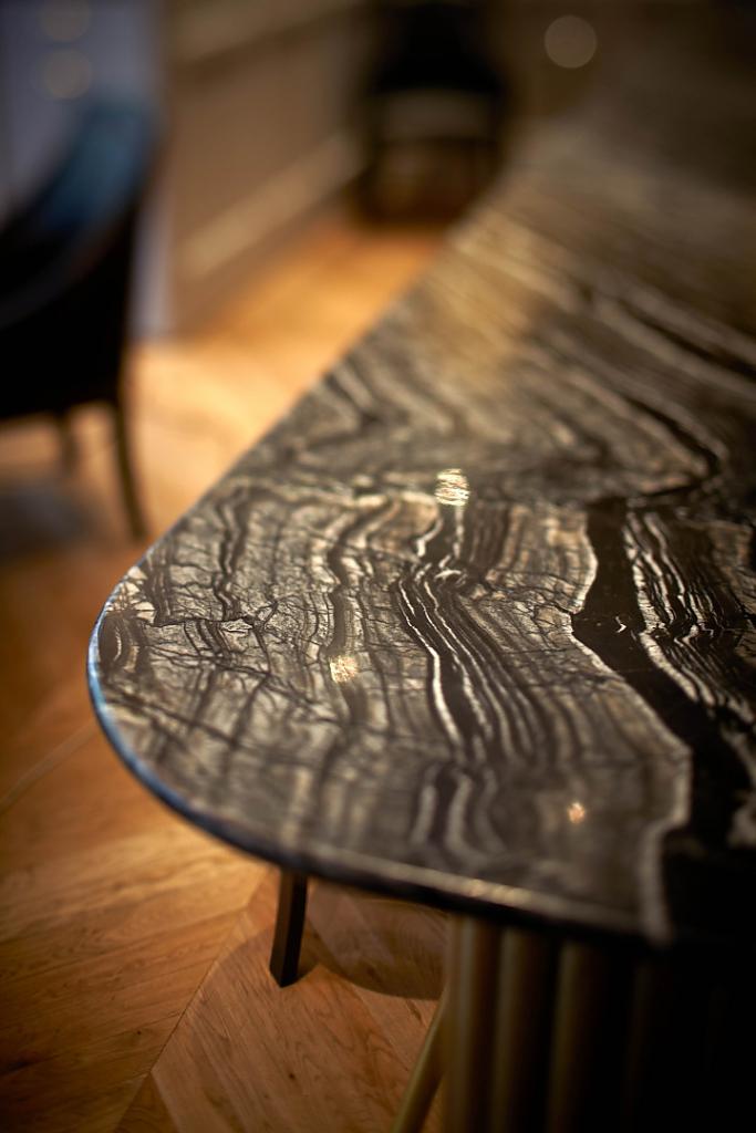 Мебель Chez Patrick только из дерева, что придает интерьеру некой старины. Эффект «старения» на поверхности столешницы бара, вносит рукотворный шарм в интерьер. Среди небоскребов большого города, множества машин, такой эффект переносит посетителей на несколько столетий назад.