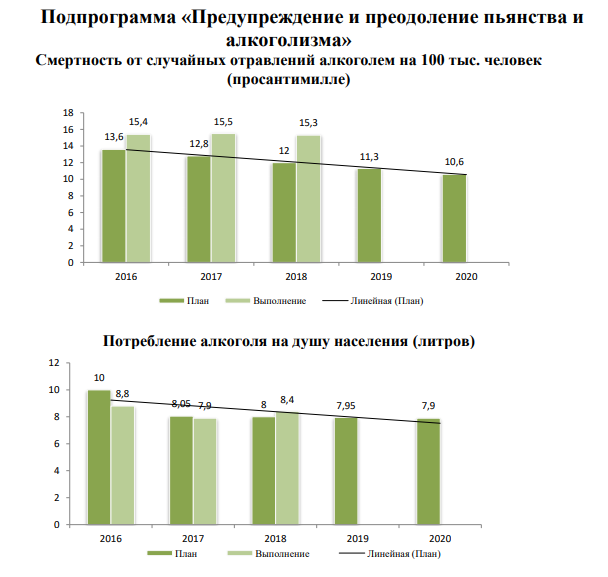 - Минздрав в рамках этой подпрограммы осторожно запланировал снижение потребления алкоголя населением до уровня 7,95 литра на душу в 2019-м году, и до 7,9 литра в 2020-м. То есть к концу программы ожидается, что мы станем меньше пить всего на 100 мл ниже опасного уровня. Но при текущей тенденции (см. пункт 2), достижение этой цели почти неосуществимо (разве что при жонглировании цифрами в отчетности).