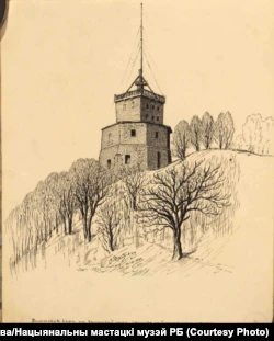 Я. Драздовіч. Кутняя вежа на Замкавай гары ў Вільні. Выгляд ад Бэрнардзінскага саду. 1930 год