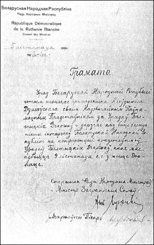 Грамата Урада БНР аб прызначэнні Дуж-Душэўскага надзвычайным паўнамоцным прадстаўніком пры ўрадах балтыйскіх дзяржаў. 1919 год. Крыніца: Нацыянальная акадэмія Беларусі. Фота: radzima.org