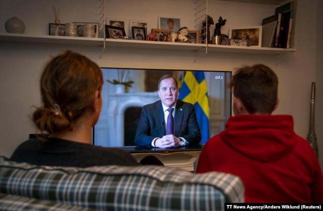 Жыхары Стакгольма глядзяць зварот швэдзкага прэм’ера Стэфана Лёвэна ў сувязі з распаўсюдам каранавірусу