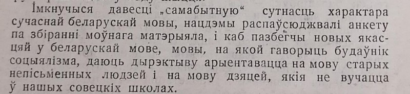 «У сваёй рабоце — з чым большай пролетарскай ярасцю будзем выкрываць і граміць беларускі нацыяналізм … чым вышэй уздымем і загартуем класавую пільнасць, тым з яшчэ большымі поспехамі пад кіраўніцтвам партыі Леніна-Сталіна пойдзем наперад да новых перамог», — акурат такімі словамі адкрывалася канфэрэнцыя па рэформе беларускага правапісу 1930-ых гадоў.
