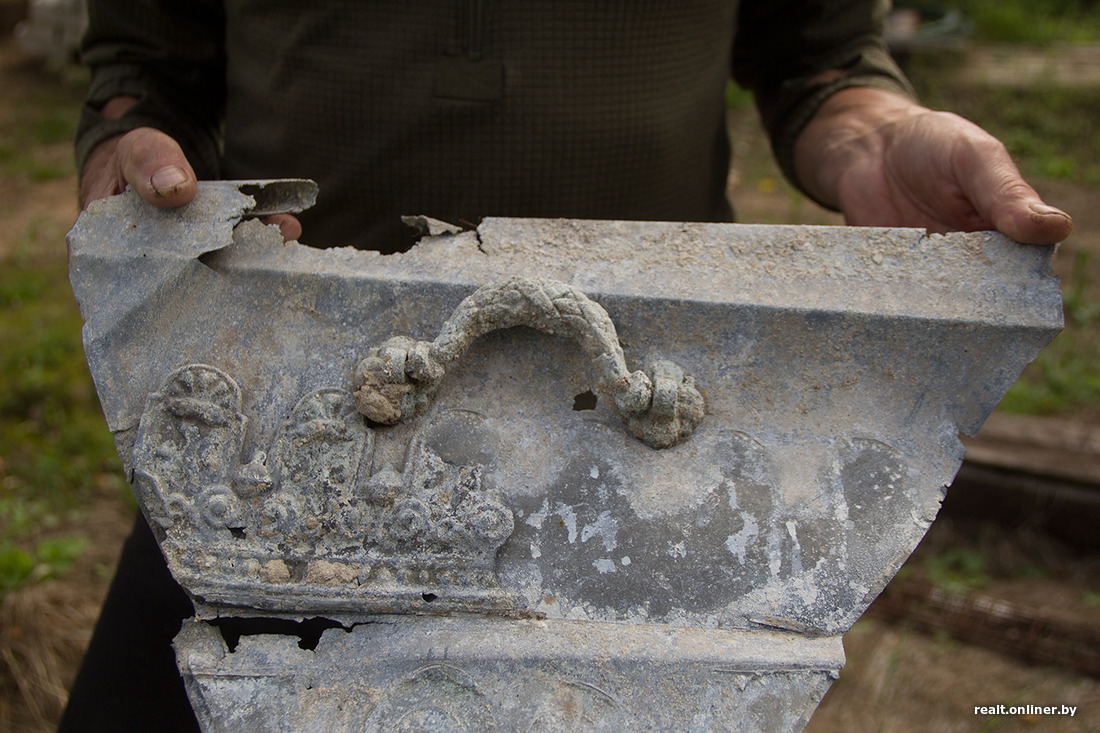 — Помнік жонцы генерала знайшоў выпадкова, калі прастукваў ломам тэрыторыю. Пліта ляжала вунь там, далей, пад яблыняй. А пастамент Паўлу выявіў, калі чысціў завал усярэдзіне капліцы. Пакуль ён ляжыць на зямлі, але з часам і пастаўлю яго.