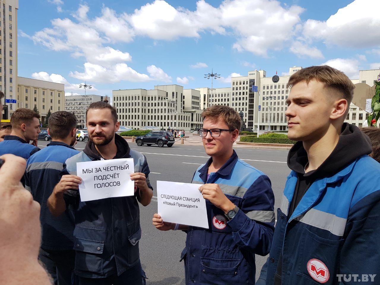 14.30. В полдень сотрудники Минского метрополитена вышли на акцию протеста – на площадь Независимости, где находится здание управления подземки. Как сообщает TUT.BY, они стояли с листовками «Мы за честный подсчет голосов» и «Следующая станция — «Новый президент». Был у них в руках и большой бело-красно-белый флаг.