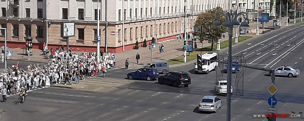 12.39. Колонна женщин прошла мимо КГБ. В руках плакаты, в том числе «Не сметь истязать наших детей!».