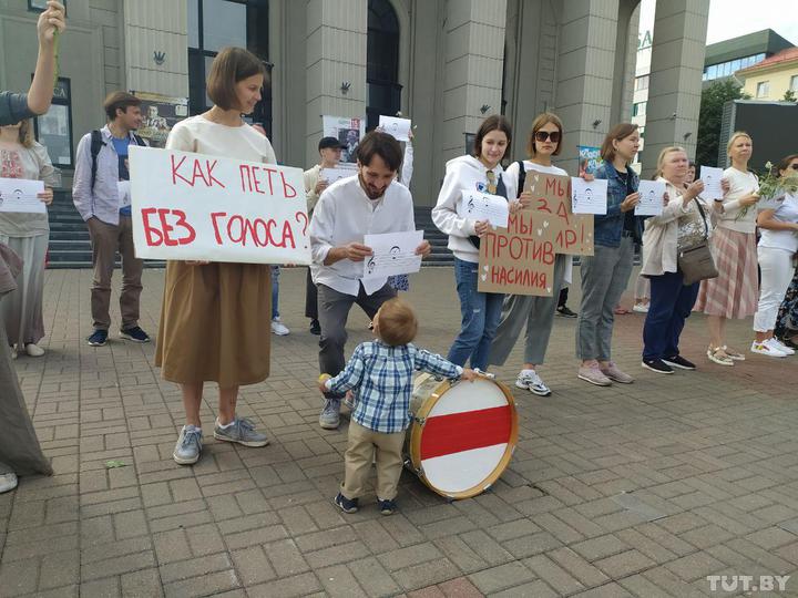 9.30. На проспекте Независимости в районе Якуба Коласа проспект гудит с утра. У Филармонии в цепь солидарности и против насилия выстроились музыканты – они выходят уже второй день.