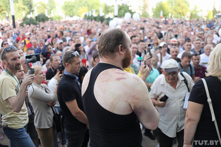 На сцену вышел мужчина, стал поднимать майку и показал свои побои. Его забрал ОМОН возле Дома пионеров, по словам парня, за компанию. Люди кричат «жыве Беларусь!».