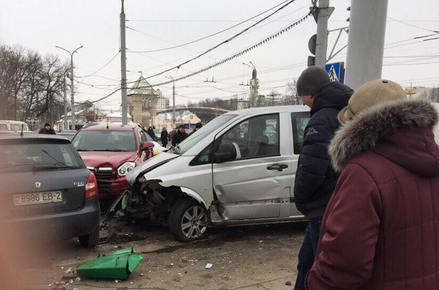 Как сообщают очевидцы аварии, микроавтобус Mercedes после столкновения с Volvo выехал за пределы дороги и сбил четверых пешеходов, которые стояли у перехода в ожидании разрешающего сигнала светофора. После чего продолжил движение и врезался в припаркованный на площади Свободы Geely. По словам водителя, который в тот момент находился в салоне, одну из женщин буквально протащило ему под капот.