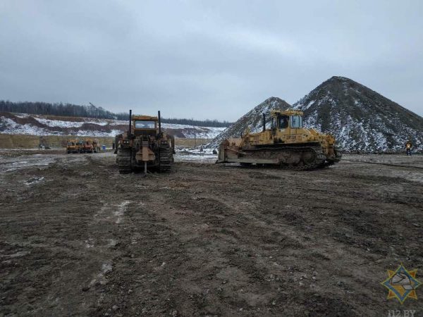 Карьерный самосвал «БелАЗ-7540А», который весит несколько десятков тонн, вытягивали при помощи огромного шагающего экскаватора и нескольких мощных бульдозеров.