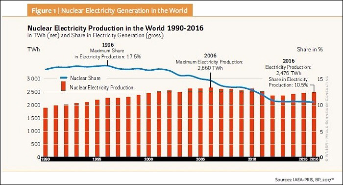Доля выработки электроэнергии на АЭС уже снизилась до психологически значимой величины. В трех десятках стран атомные станции суммарно вырабатывают чуть больше 10% всей мировой электроэнергии. Более половины суммарной атомной энергии производят три страны — США, Франция и Китай. За последние два десятилетия доля атомной энергии снизилась почти в два раза.